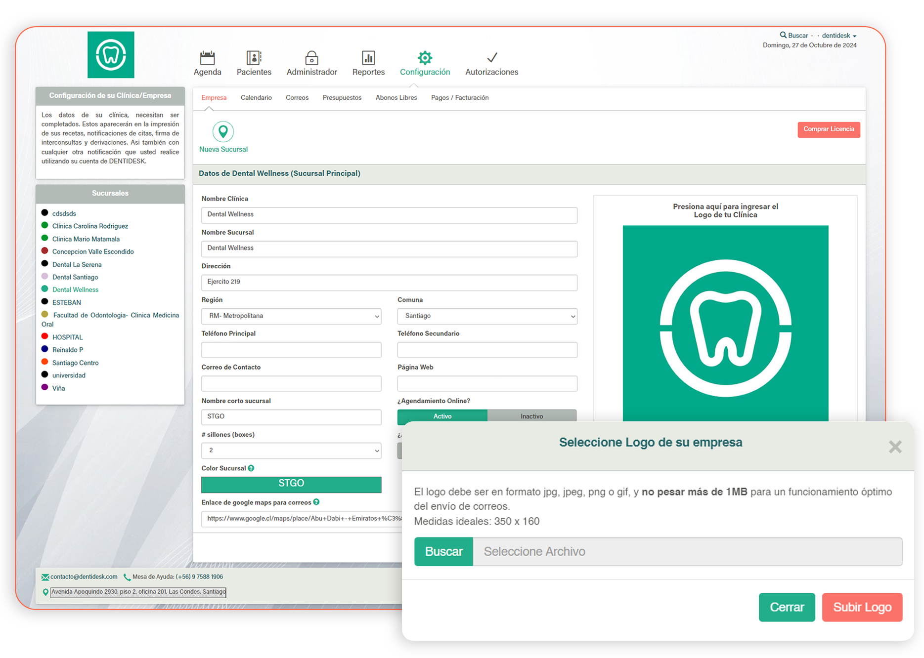 Aquí debes ingresar todos los datos de tu clínica, como nombre, sucursal, dirección, correo de contacto y teléfono, además de la opción de subir el logo propio. Es importante completar la información lo más completamente posible, ya que aparecerá en notificaciones, derivaciones y documentos enviados a los pacientes.