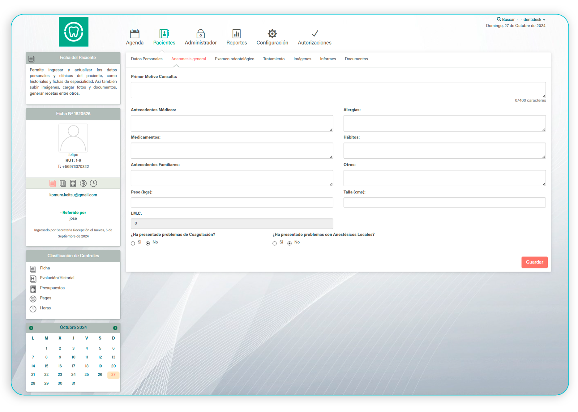 La anamnesis general es una herramienta fundamental que te permite registrar de manera detallada el historial médico y dental de tus pacientes. Esta sección asegura que tengas toda la información necesaria para proporcionar un diagnóstico preciso y un tratamiento personalizado. 🩺🦷