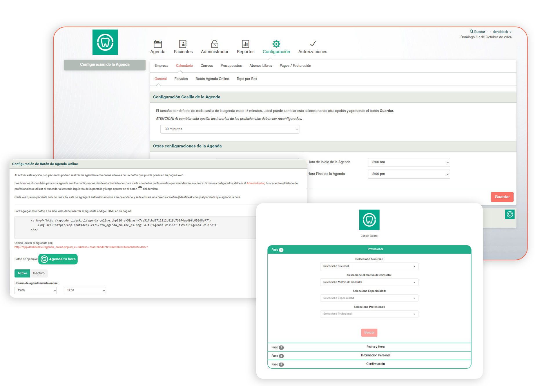 Crea y configura los días y horarios en los que quieres tener agendamiento de pacientes. Puedes configurar el formato de la hora, cada cuanto tiempo quieres agendar a los pacientes (ej 15, 30, 40 min). Además, tienes la facultad de incorporar los feriados para que automáticamente la agenda se bloquee. Puedes incorporar el botón de agendamiento online en tu página web, obteniendo el link en esta sección.