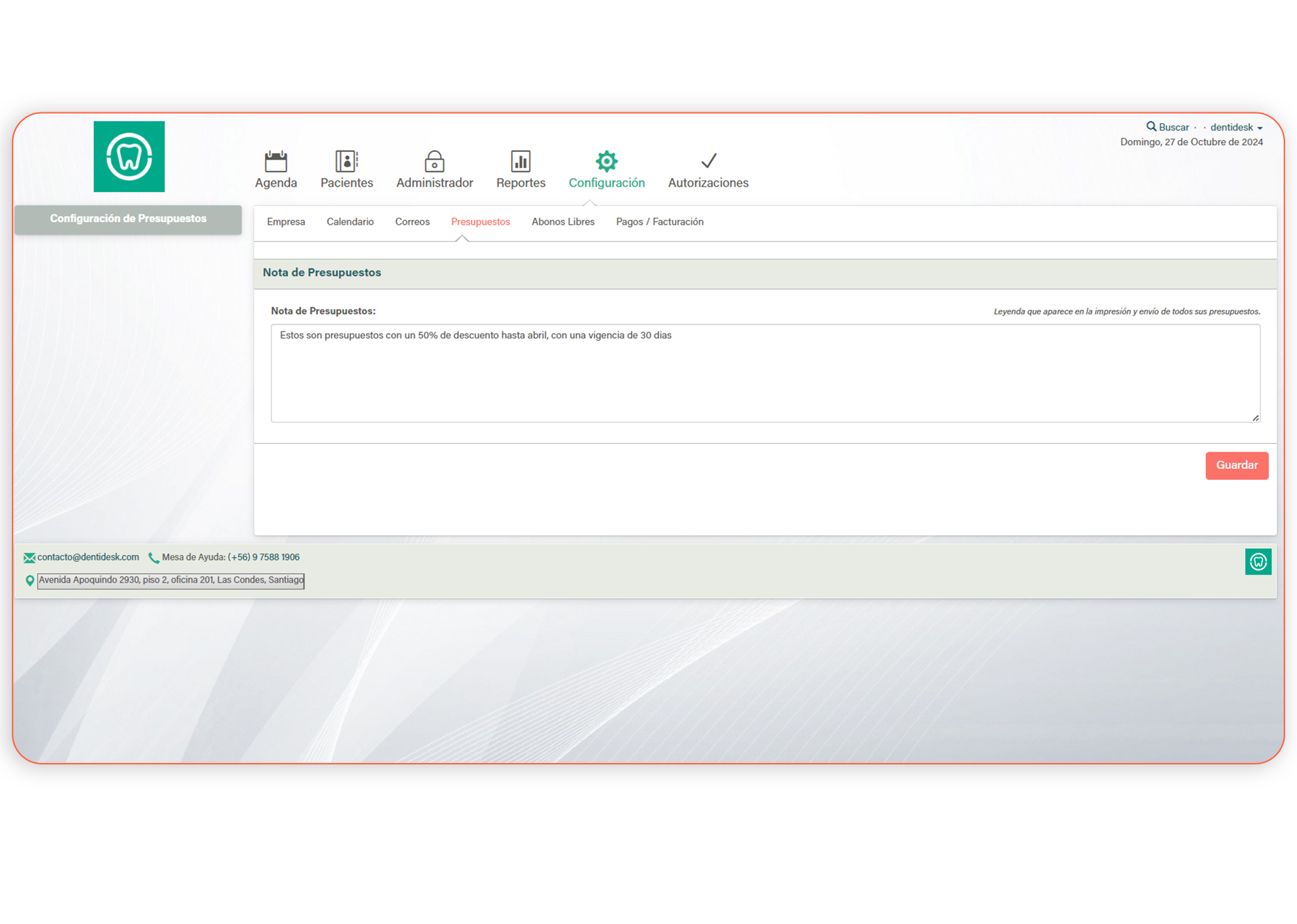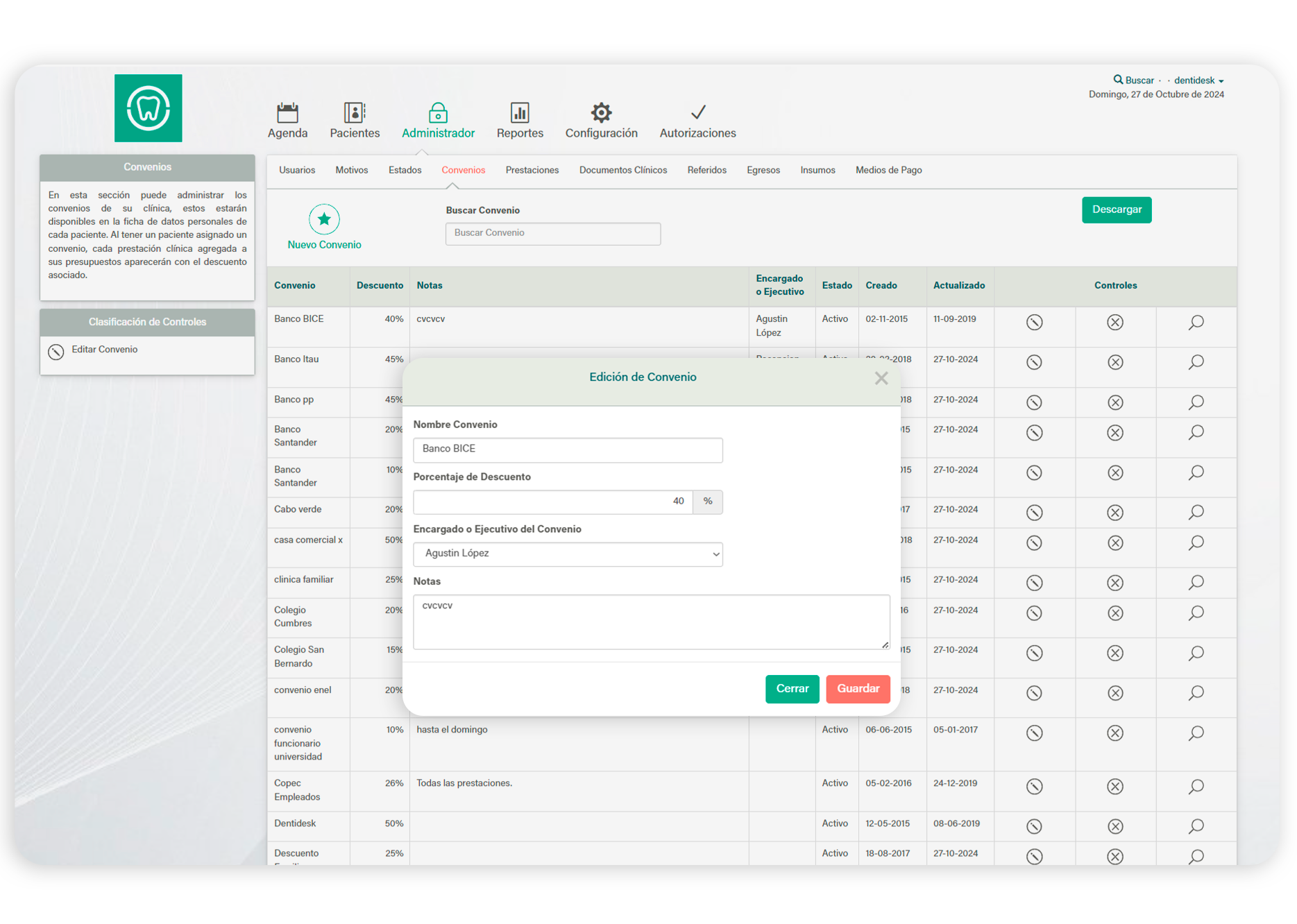 La plataforma permite que como administrador de su clínica puedan ingresar los convenios que quieran considerar a la hora de realizar planes de tratamiento y presupuestos. Se crean todos los convenios, los cuales estarán disponibles en la ficha de datos personales del paciente, y en caso de tenerlo asignado, se le realizará el descuento asociado.