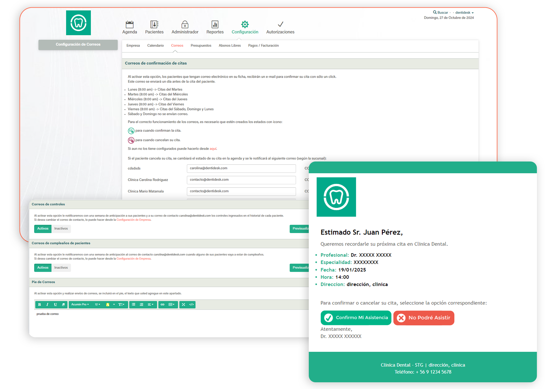 Existe la opción de activar los correos de confirmación de cita a los pacientes, que llegarán un día antes de su hora agendada. En ese mismo correo pueden confirmar o anular la cita. Por otra parte, se puede gestionar el envío de correos de recordatorio a pacientes que deben agendar un control. Además existe la posibilidad de enviar correos a los pacientes de cumpleaños e incorporar pies de correo con un texto que determine, para que aparezca en todos los correos enviados desde la clínica.