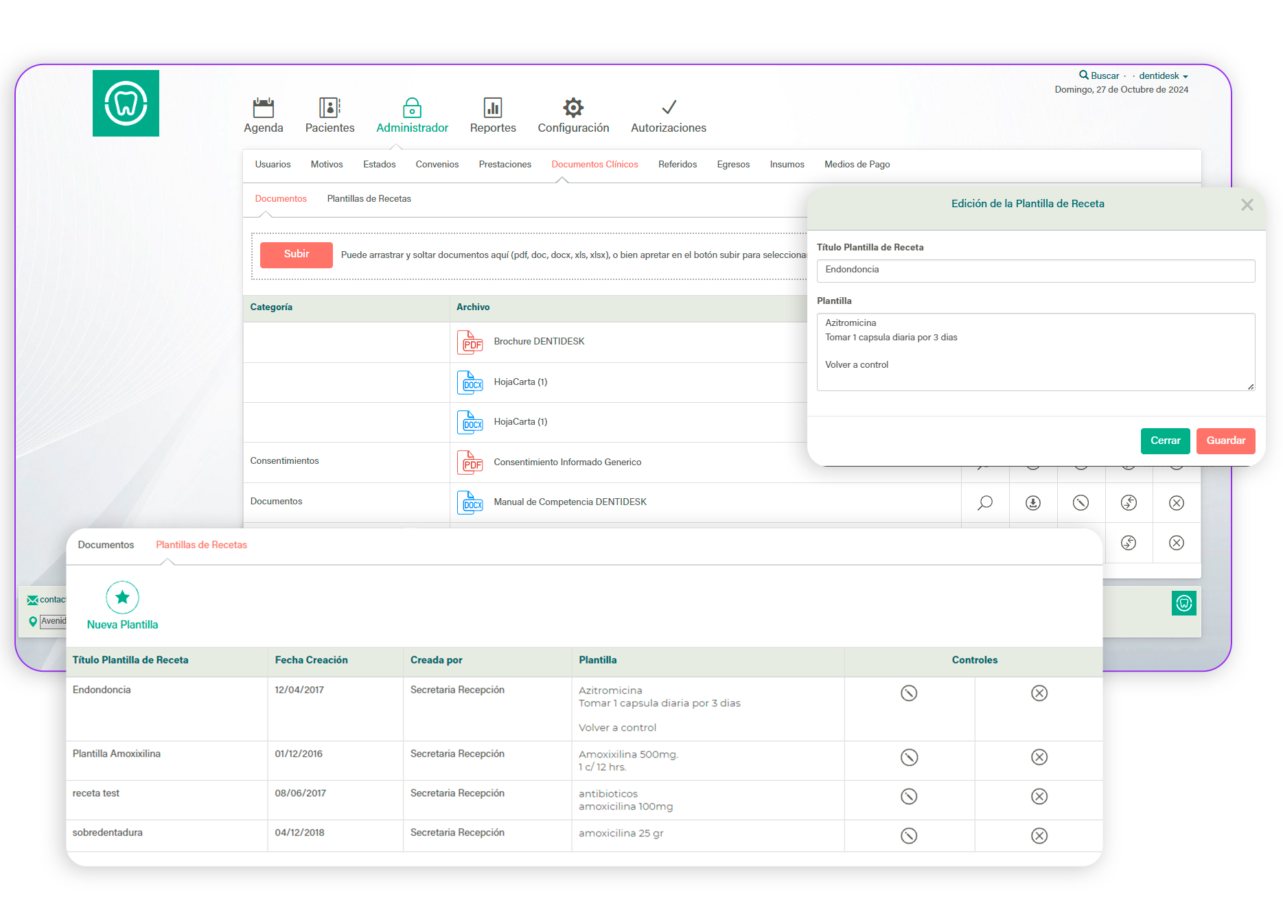En esta sección puedes cargar documentos que serán de uso recurrente en tu clínica para poder tener un acceso más expedito. Además se pueden crear plantillas de recetas, todo en beneficio de una atención más rápida y diligente.