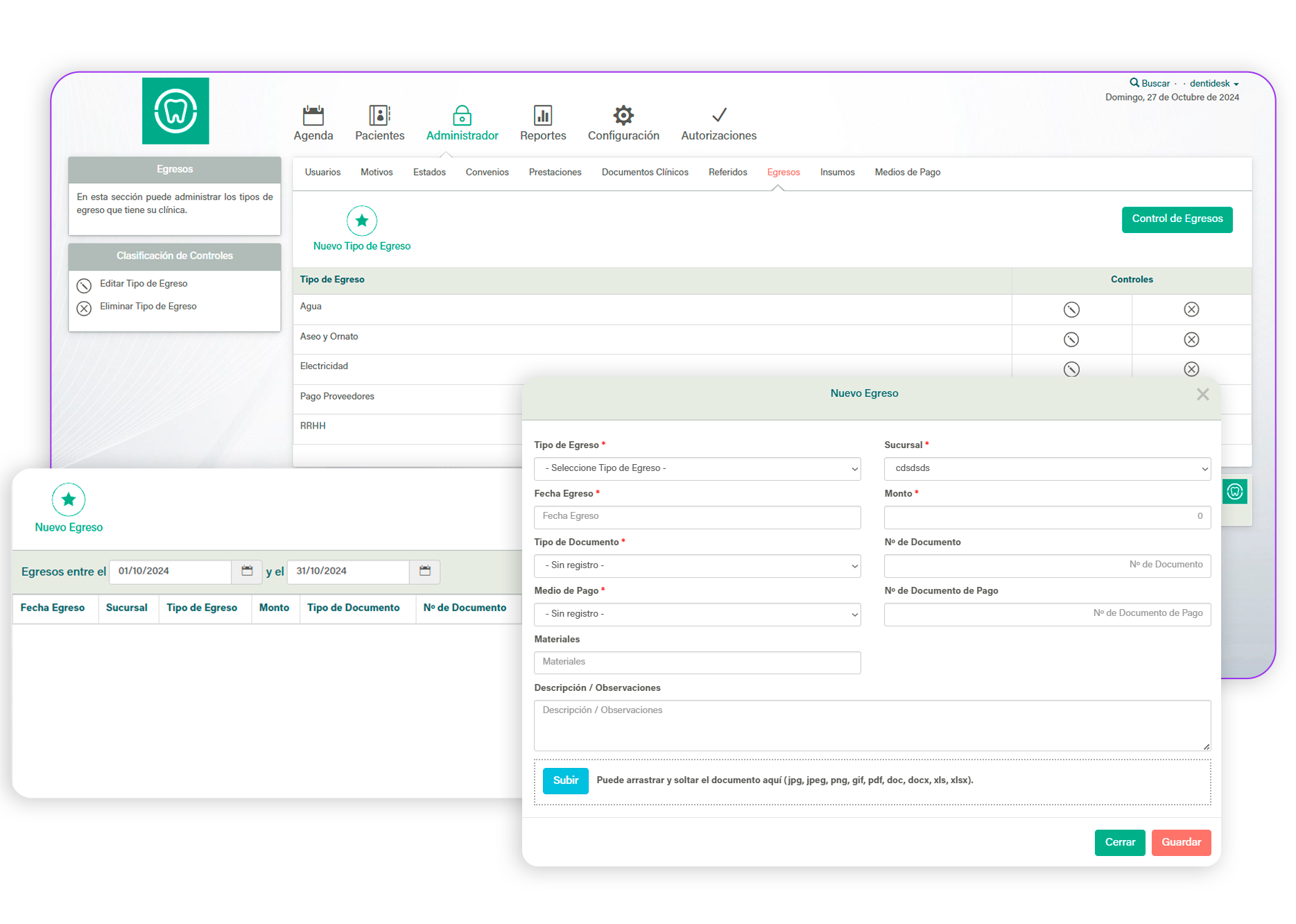 En esta sección puedes crear todo tipo de egresos que existen o podrían existir en tu clínica, de esta manera, se logra mantener un registro general, facilitando la administración y orden de lo que realicen en la clínica.