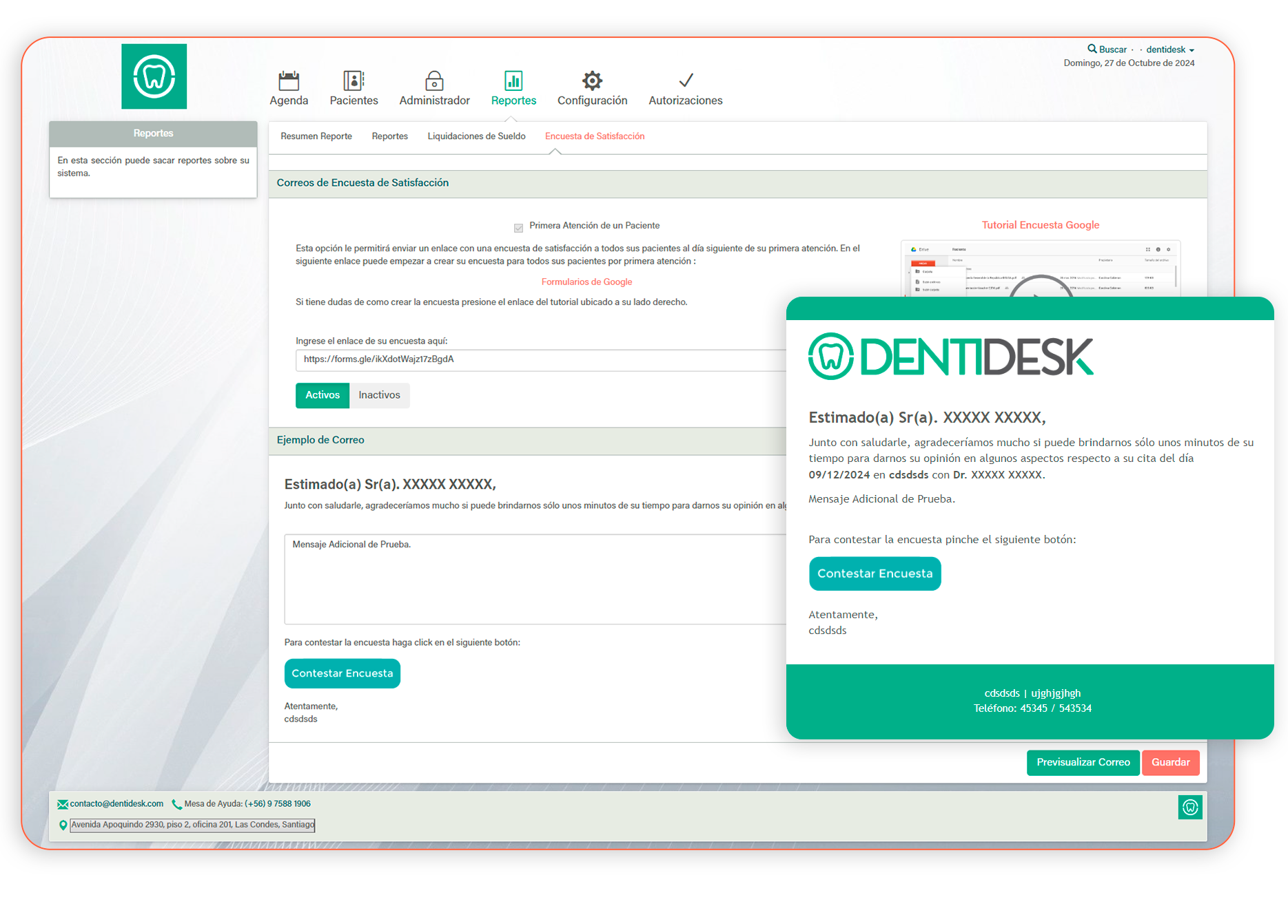 Puedes crear una encuesta en formulario de Google e incorporarla a esta sección para que le llegue a cada uno de los pacientes posterior a su primera atención en la clínica. De esta manera, se obtiene retroalimentación para mejorar y además involucrar al paciente en su atención y tratamiento.