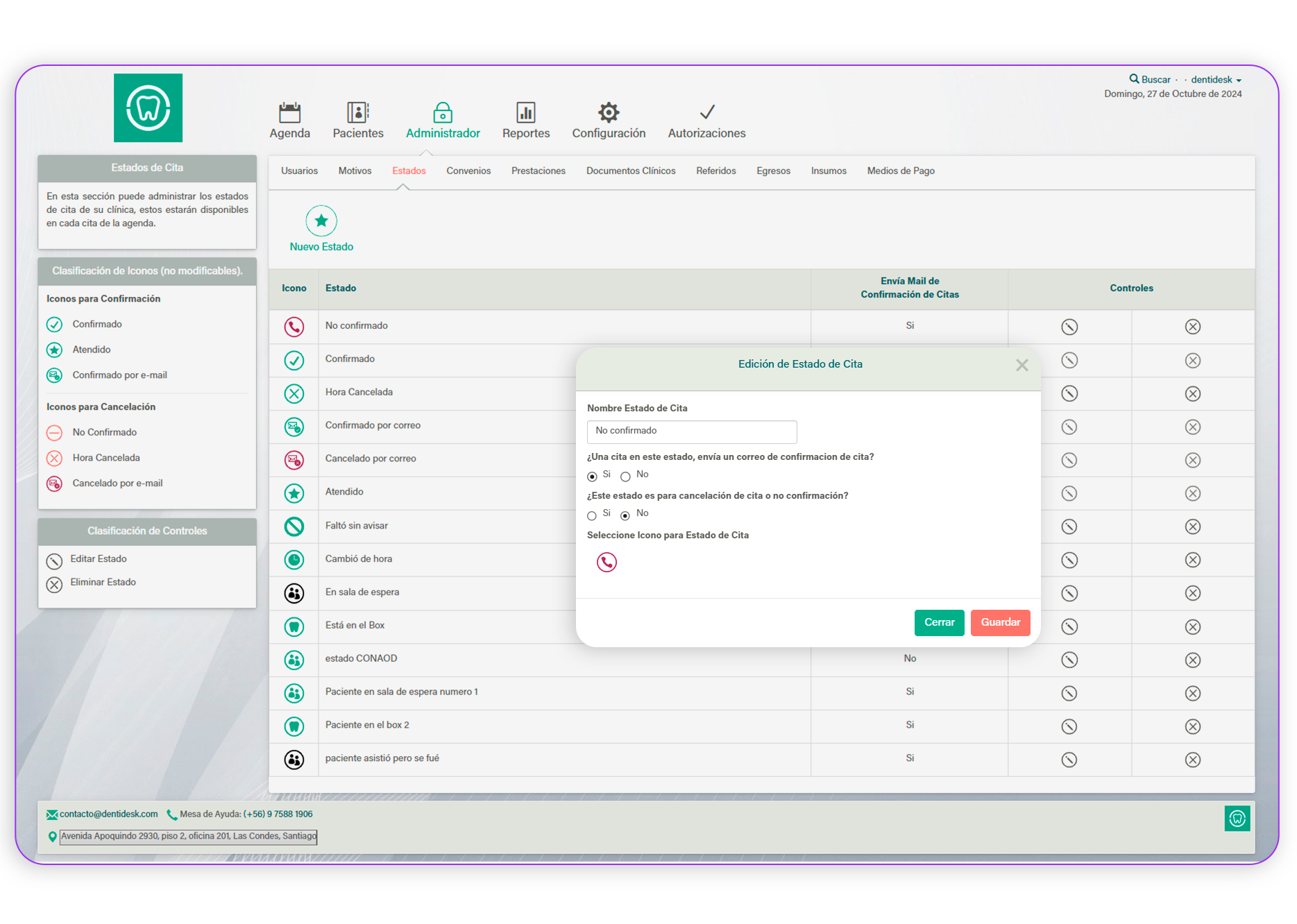 Puedes crear los estados de cita con el nombre e ícono que más te acomode. Esto será un apoyo visual a la hora de agendar un paciente y llevar su seguimiento.