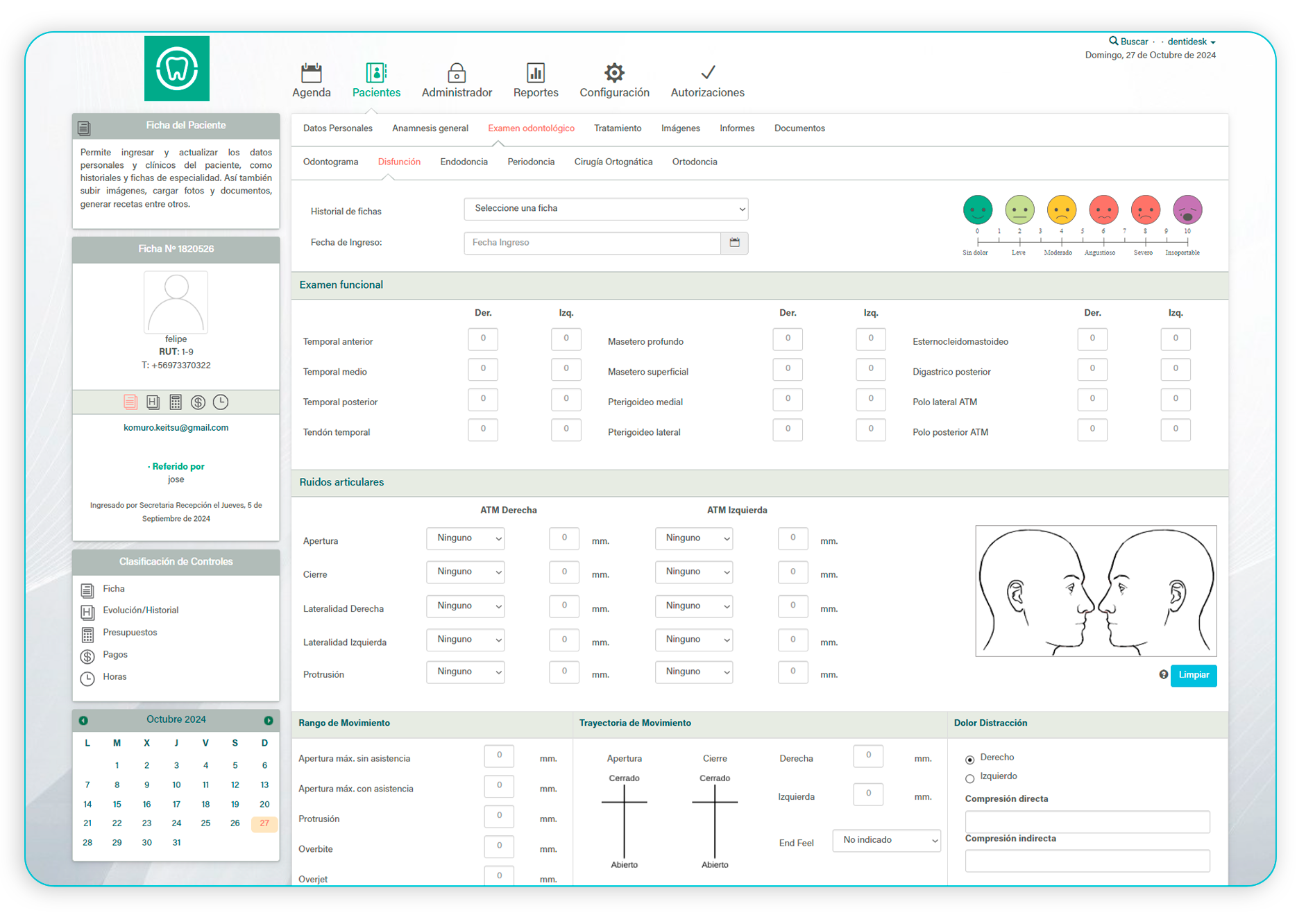 Nuestro sistema cuenta con fichas especializadas para facilitar evaluaciones detalladas y precisas de la salud bucal de tus pacientes. Podrás documentar y seguir el progreso de cada tratamiento donde encontrarás un odontograma completo, disfunción, endodoncia, periodoncia, cirugía ortognática y ortodoncia. Mejora la calidad de tus diagnósticos y optimiza tu tiempo con nuestra solución intuitiva y eficiente.