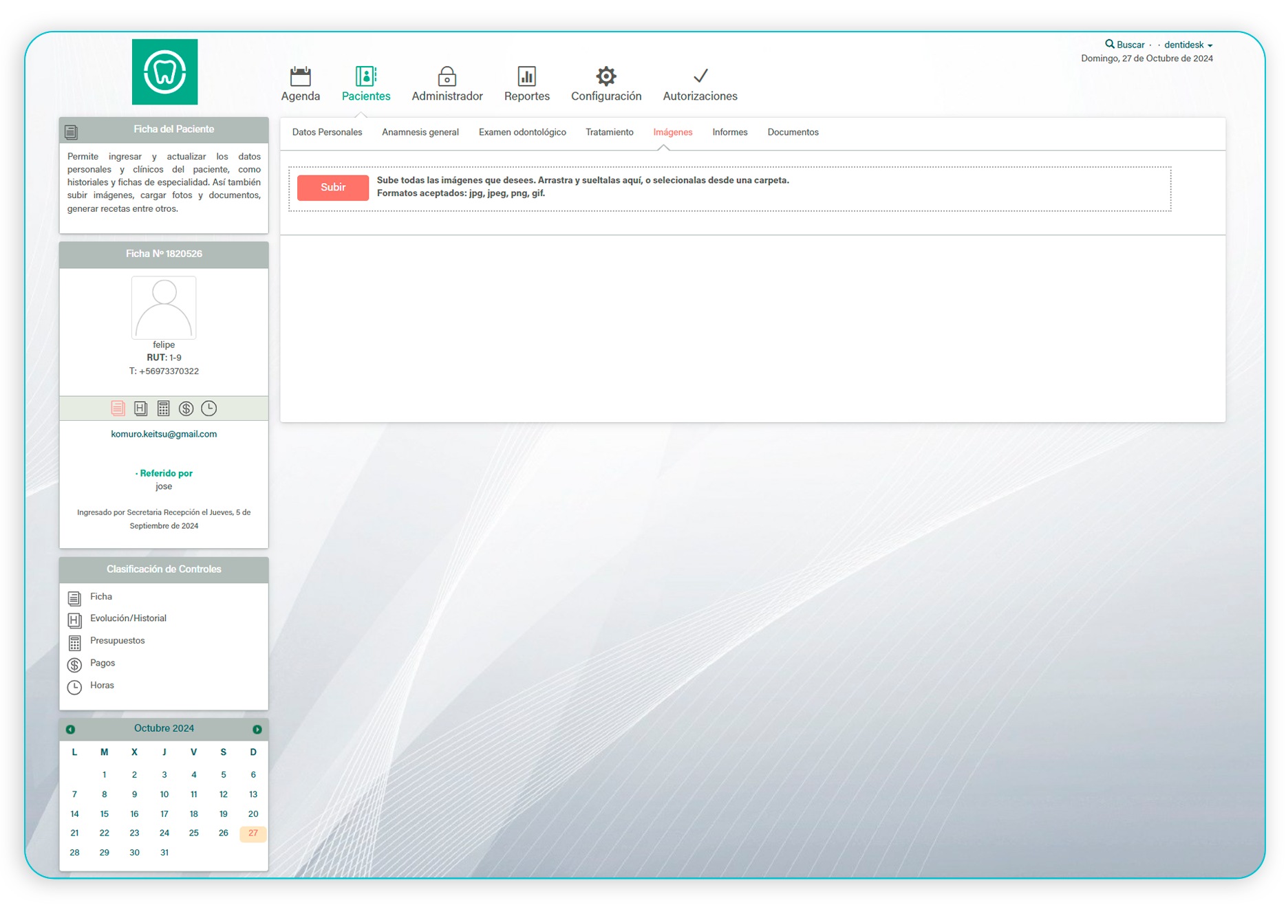 En el módulo de Imágenes, podrás cargar radiografías y otras imágenes de interés para el registro del paciente. Nuestro sistema acepta formatos jpg, jpeg, png, y gif, asegurando una fácil y rápida integración de todas las imágenes relevantes en el historial del paciente.