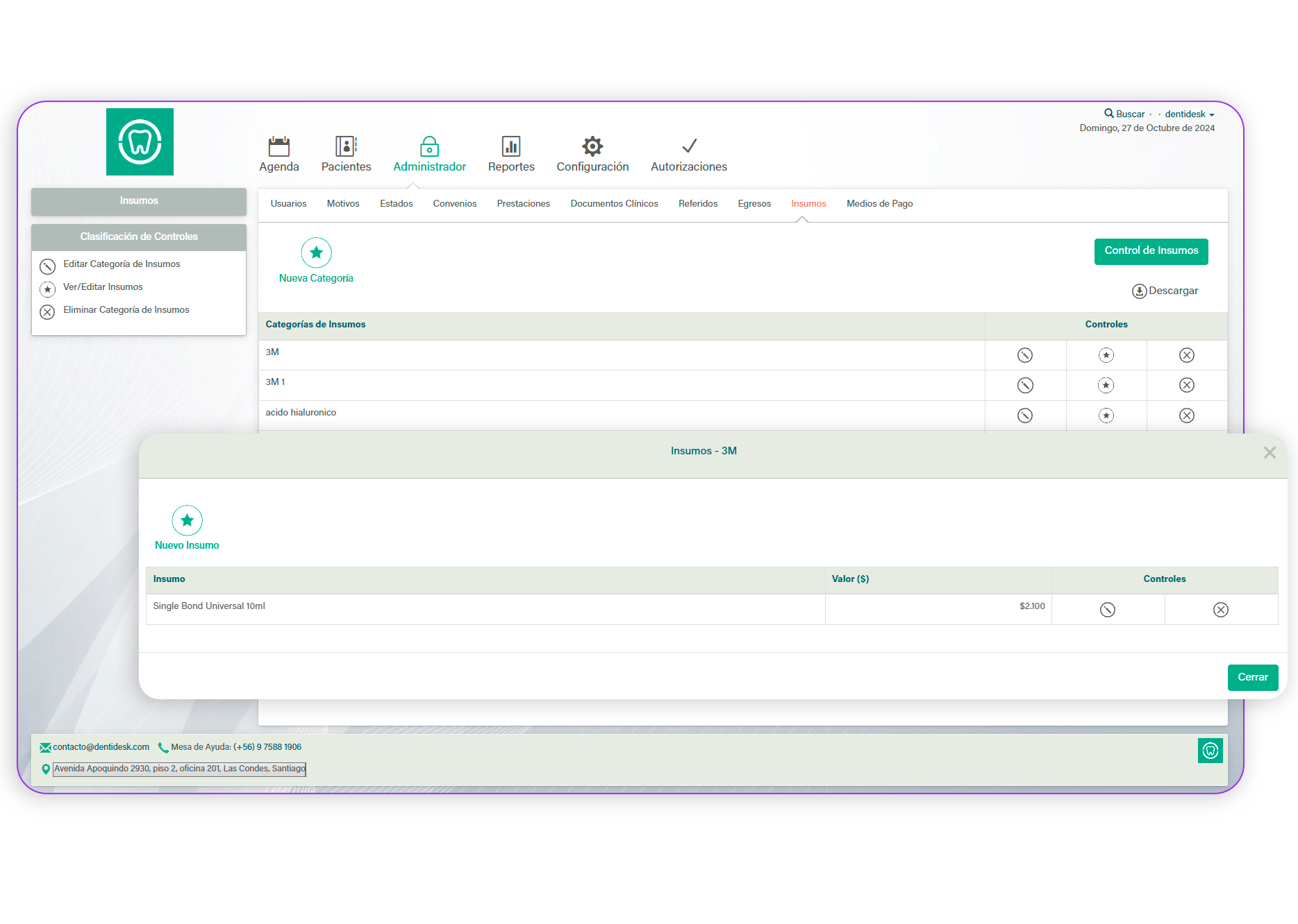 Puedes ingresar categorías junto a sus insumos. Se crean los insumos con sus nombres y valores correspondientes. Dentro del control de insumos, se puede ver un resumen de los insumos solicitados y los insumos retirados, de esta manera llevar el registro del stock en la clínica. ¡Así de fácil!