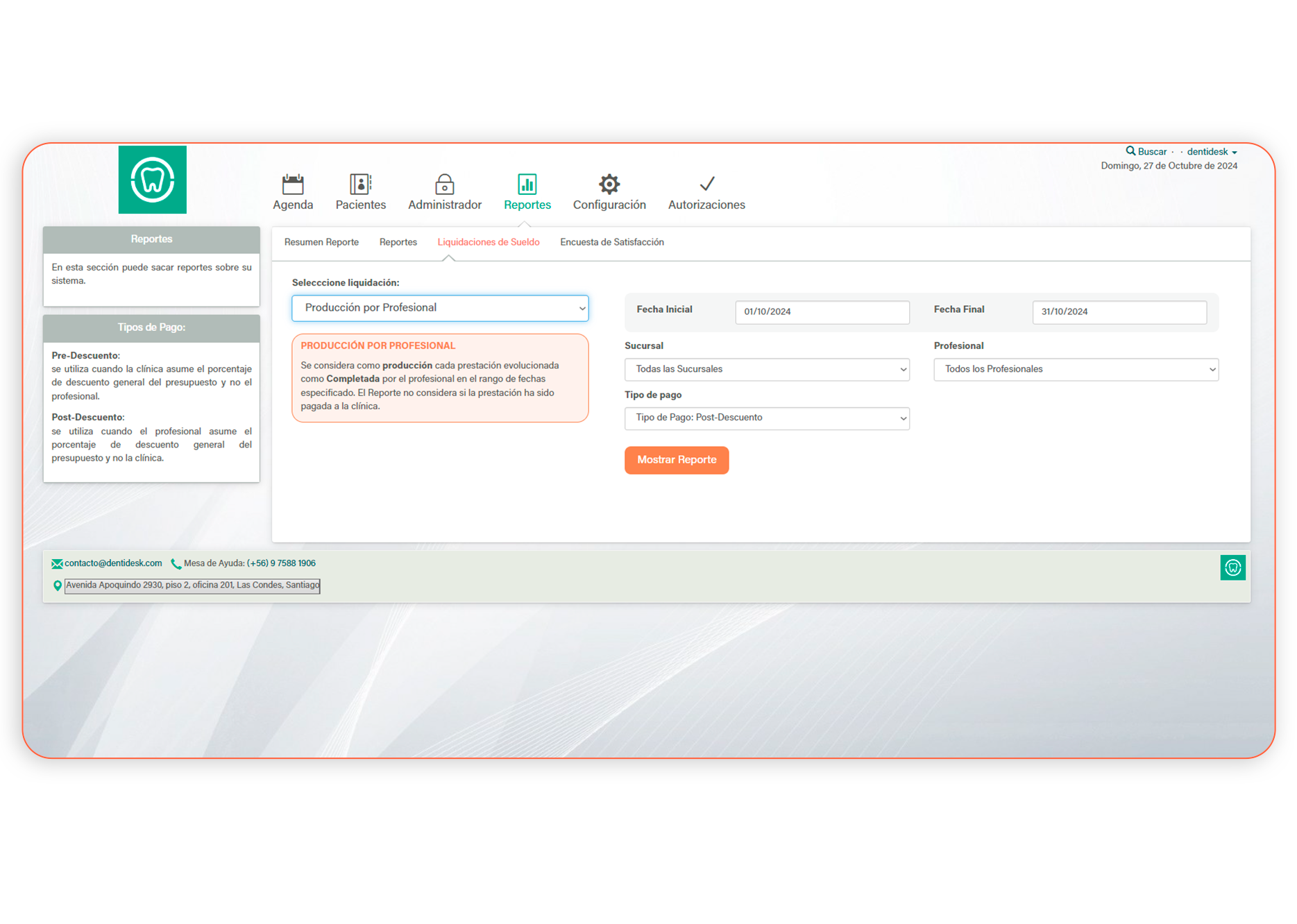 Dentro de la misma plataforma puedes obtener la producción por profesional, la liquidación por producción de cada profesional que trabaja en tu clínica. Ahorra tiempo con el uso de DENTIDESK, donde todo se encuentra al alcance para todo tipo de administración.