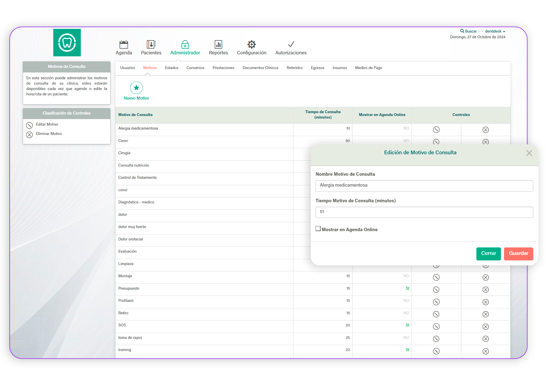Categoriza y gestiona las citas de tus pacientes con una precisión impecable. Define los motivos de consulta y ajusta cada cita para que se adapte perfectamente a las necesidades de tus pacientes. ¡Dale a tu clínica la organización que merece y sorpréndete con la eficiencia de DENTIDESK!