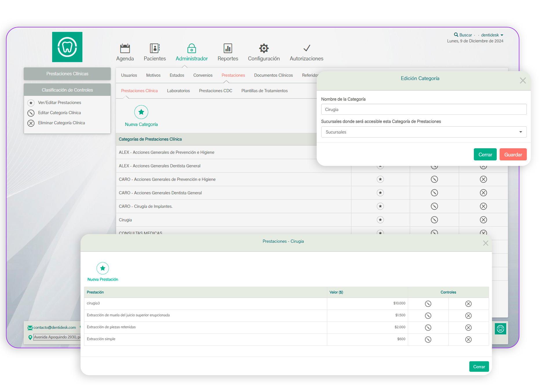 Gestiona tus propias categorías y prestaciones para la clínica.