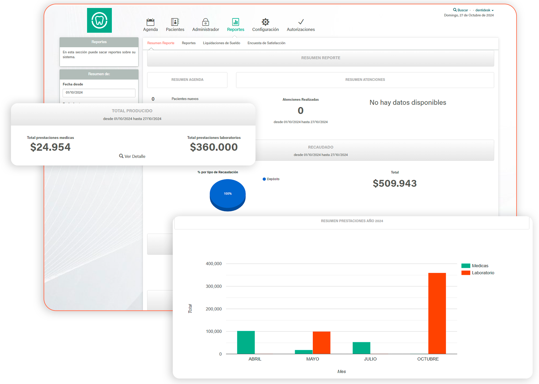 En esta sección puedes ver un resumen de tu agenda, las atenciones realizadas y lo recaudado, entre otros datos que permiten generar un balance dentro de un período específico. También puedes consultar estadísticas detalladas, como Producción, Recaudación, Pacientes Morosos y Prestaciones