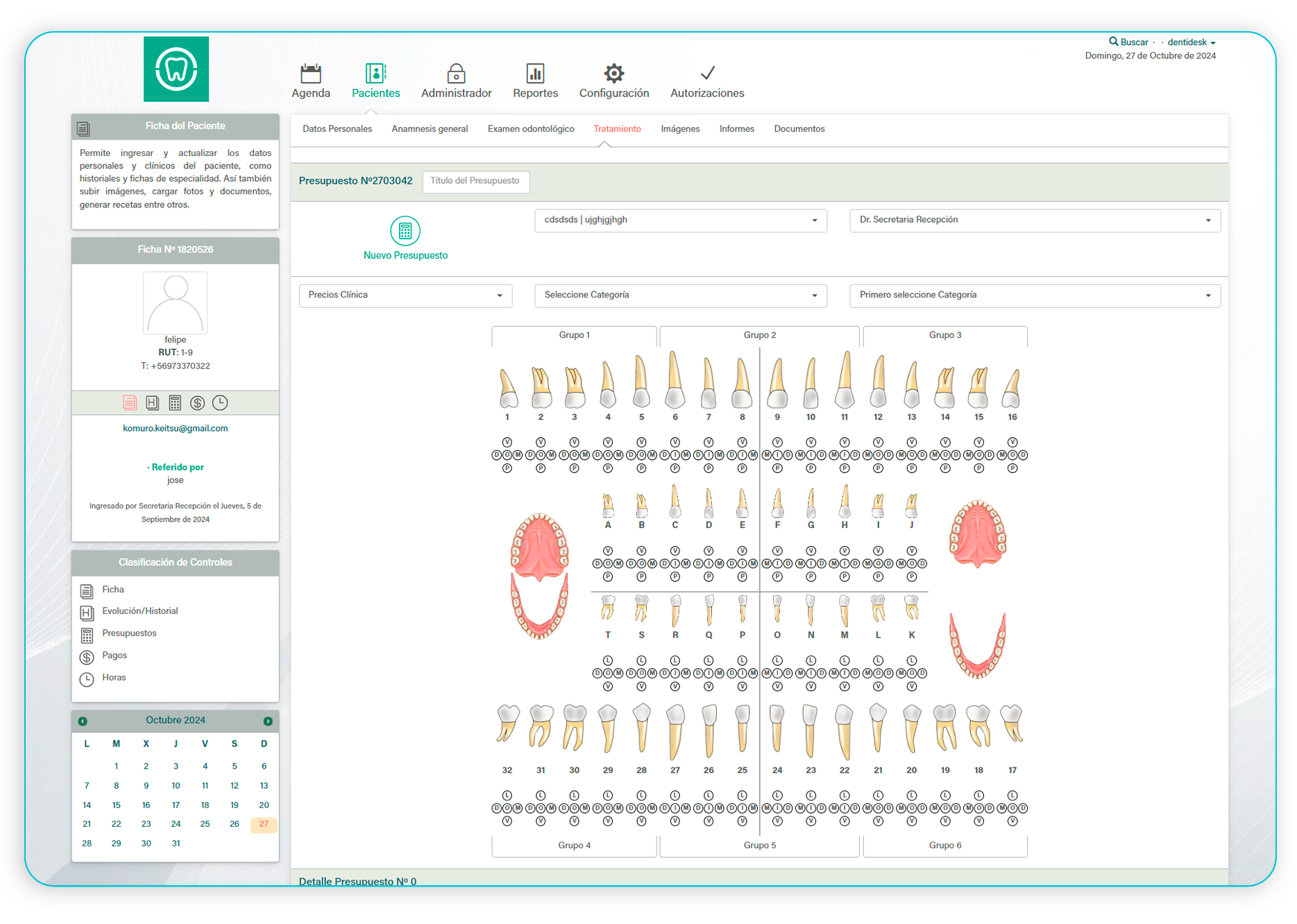 DENTIDESK facilita la creación y gestión de presupuestos de manera eficiente. Podrás crear títulos de presupuesto, seleccionar la clínica y el doctor responsable, y elegir entre diferentes grupos de precios como los de clínica, laboratorio o utilizar plantillas de tratamiento para ver las prestaciones y valores. Mientras seleccionas las piezas dentales, el sistema detallará la información del presupuesto, incluyendo área, superficie, prestaciones, subtotales, descuentos y el total, todo de manera clara y organizada para una fácil comprensión y seguimiento del tratamiento propuesto.